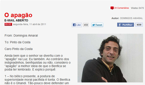2 – Desligando a luz na Luz, entrámos para a história. Tal como para si o último dos campeonatos é o “dos túneis”, este será o do “apagão”. Daqui a 30 anos, ninguém se vai lembrar dos “mind games” do Villas-Boas ou dos golitos do Hulk. Mas todos, até os portistas, recordarão o nosso “apagão”! Será o que, à lareira, os avós contarão aos netos. “Naquele ano, o Benfica apagou a luz à festa do Porto...” Parabéns, pois, ao autor da ideia.