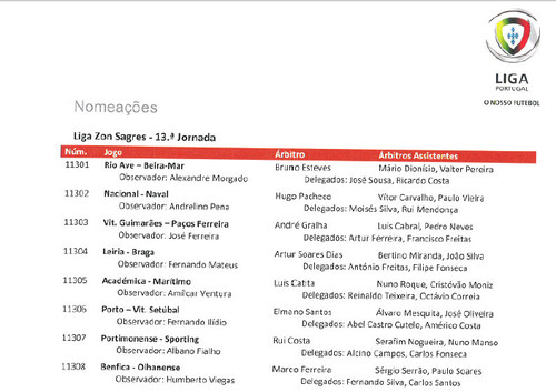 Artur Soares Dias, em Leiria, na União contra o SC Braga. É a terceira vez em treze jornadas que vai apitar os minhotos, duas fora (U. Leiria e Vitória de Setúbal, 0-0) e uma em casa (Olhanense, 3-1), mais uma do que aconteceu na época transacta.